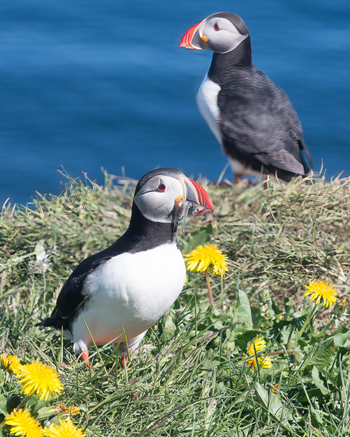 Atlantic puffin bringing food to its young, Borgurfjordur